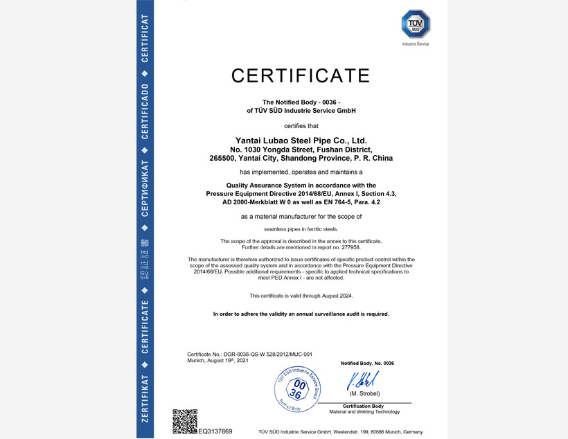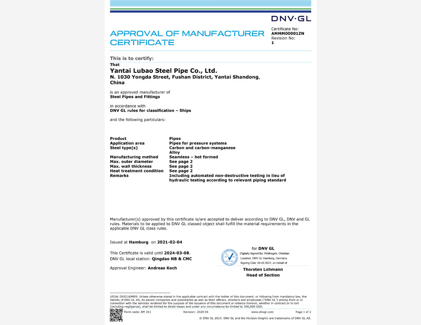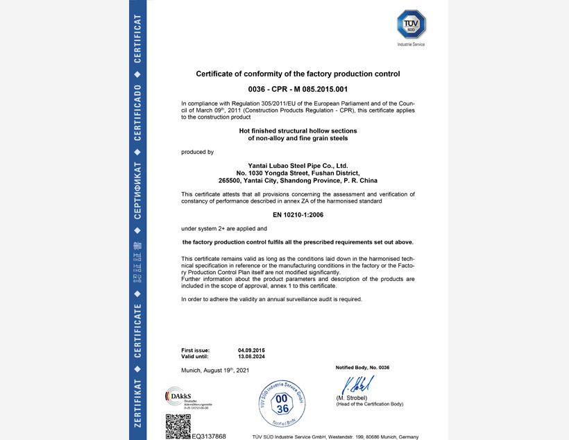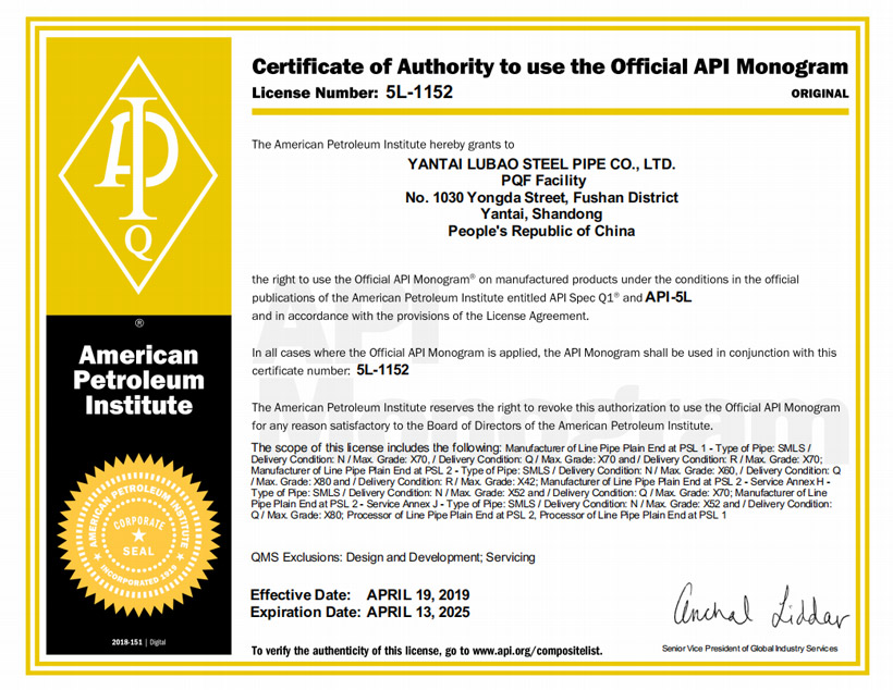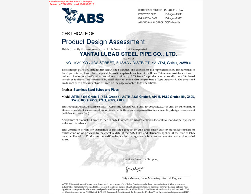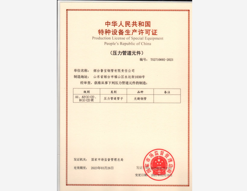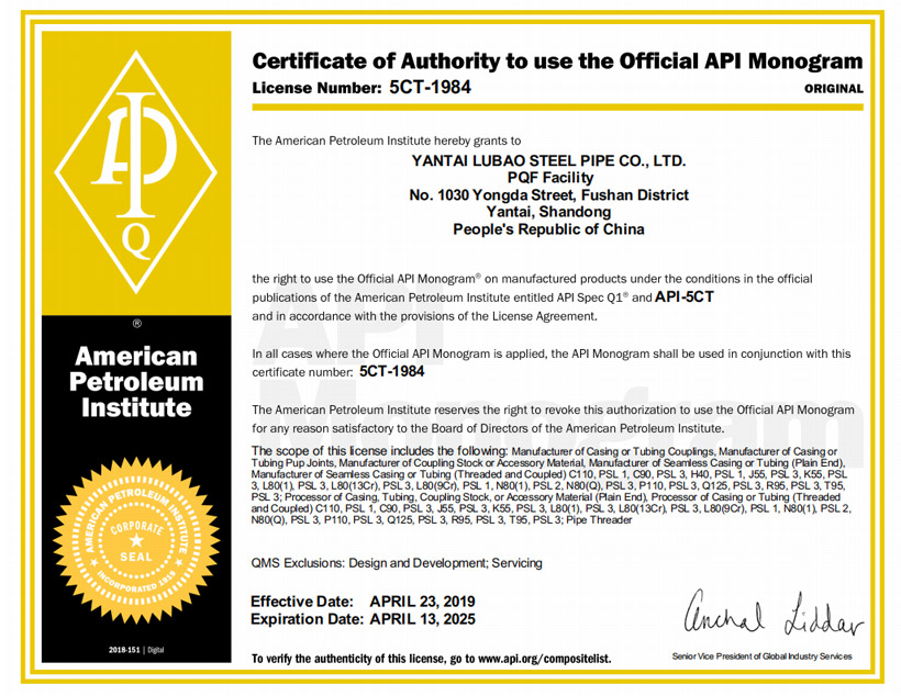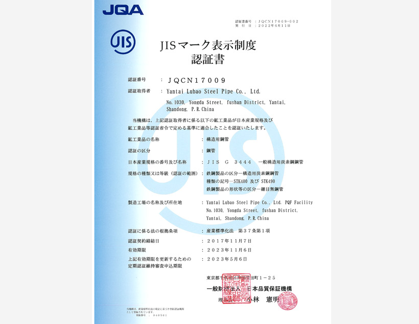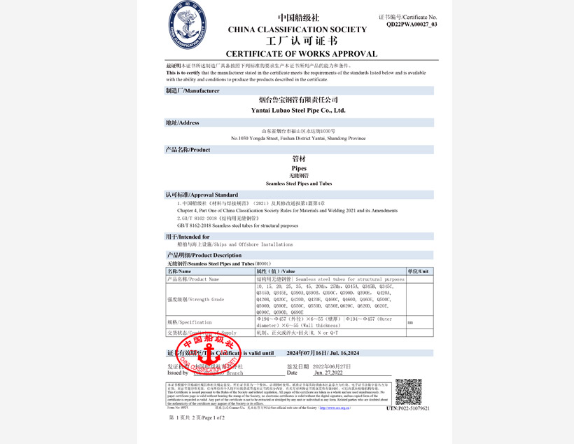 美國石油協(xié)會API 5CT認(rèn)證????|????美國石油協(xié)會API 5L認(rèn)證????|????TS(特種設(shè)備生產(chǎn)許可)????|????ABS PDA(美國船級社設(shè)計評估)認(rèn)證????|????ABS MA(美國船級社工廠評估)認(rèn)證????|????DNV(挪威船級社)認(rèn)證 ????|???? CCS(中國船級社)工廠認(rèn)可????|????? LR(勞氏船級社)認(rèn)證????|????? PED(歐盟承壓設(shè)備指令)認(rèn)證????|??? CPR(歐盟建筑用材料指令)認(rèn)證????| JIS(日本工業(yè)標(biāo)準(zhǔn))認(rèn)證