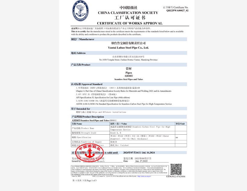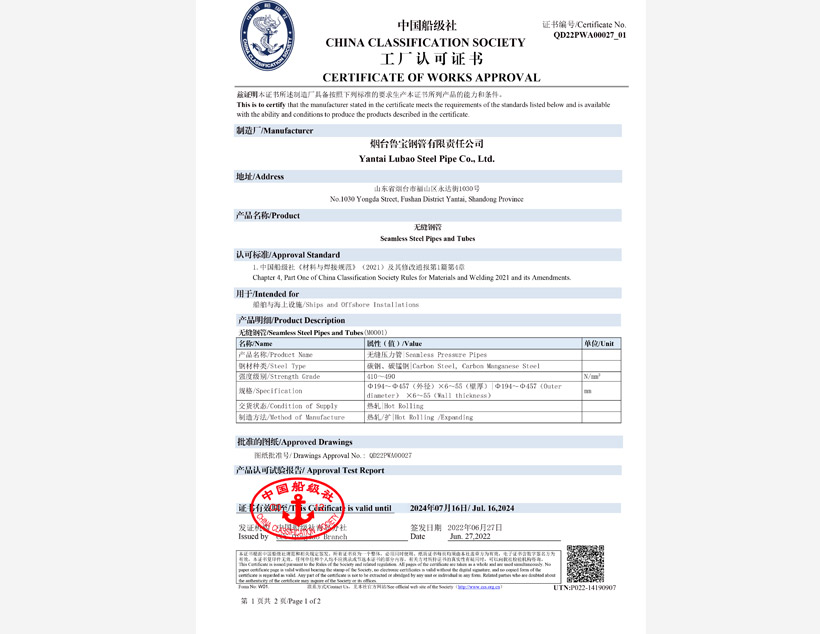 • 中國船級社CCS無縫壓力管認(rèn)可證書